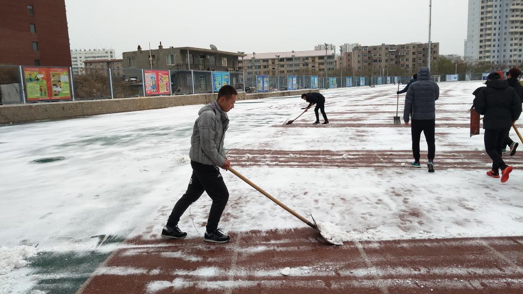 员工们组成扫雪小分队,从体育馆领取扫雪工具后在指定区域内开展积雪清扫工作。凛冽的寒风和零下的温度使扫雪工程异常艰难,同学们的脸和手都冻得通红。然而,这一切丝毫没有影响大家的热情和工作效率,体育馆外和体育场上到处都是拿着铲子和扫帚等工具忙碌的身影,大家都开足马力清扫路面上的积雪。每一个小分队都不甘示弱,有的进行着扫雪比赛;有的分工合作,一人扫雪,一人铲雪;有的轮番上阵,陆续的将积雪堆积到路边的花丛里。经过一个小时的奋战,扫雪任务圆满完成,虽然室外气温依然很低,但是同学们劳动的热情和团结的力量让这个冬日变得格外温暖。