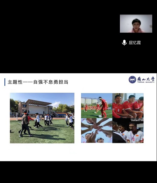 屈忆霞老师从足球课的课程目标、思政设计思路及教学反思等方面做了分享,设计思路为常态化、主体性、应变式。马院专家认为屈老师思政设计立足员工角度,强调团队合作。建议可以使用中国女足的案例,另外可以结合秦皇岛的足球推广,小员工足球联赛,也可以提一下中国男足这个问题,分析精神方面的原因及心里承受能力。