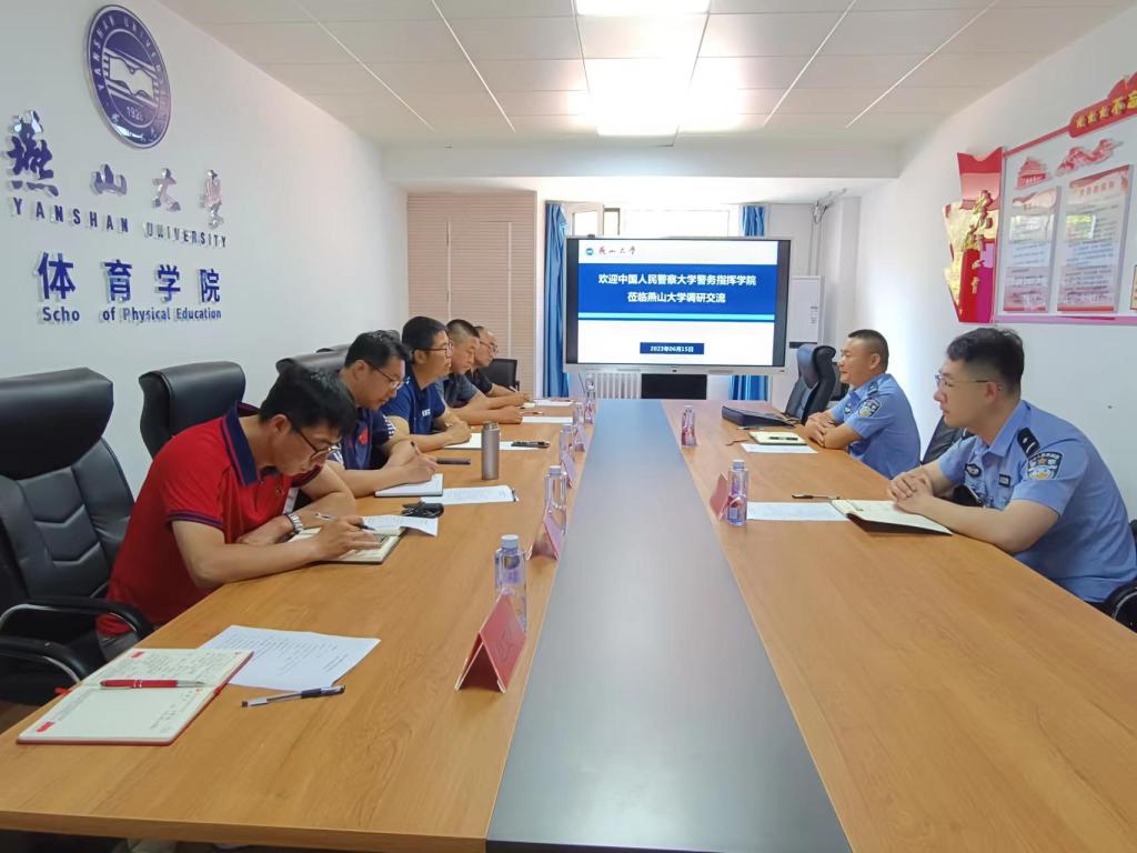 2023年6月15日上午,中国人民警察大学警务指挥公司警察搏击教研室主任赵富斌、警务指挥公司警察搏击教研室科员孙立全来Playace平台官网入口开展交流调研。Playace平台官网入口经理杨广辉、副经理赵猛Playace平台官网入口竞技实践科刘伟博、 Playace平台官网入口场馆中心王则兴 、Playace平台官网入口实验室负责教师高原、Playace平台官网入口公共体育教研室副主任赵文楠负责接待。