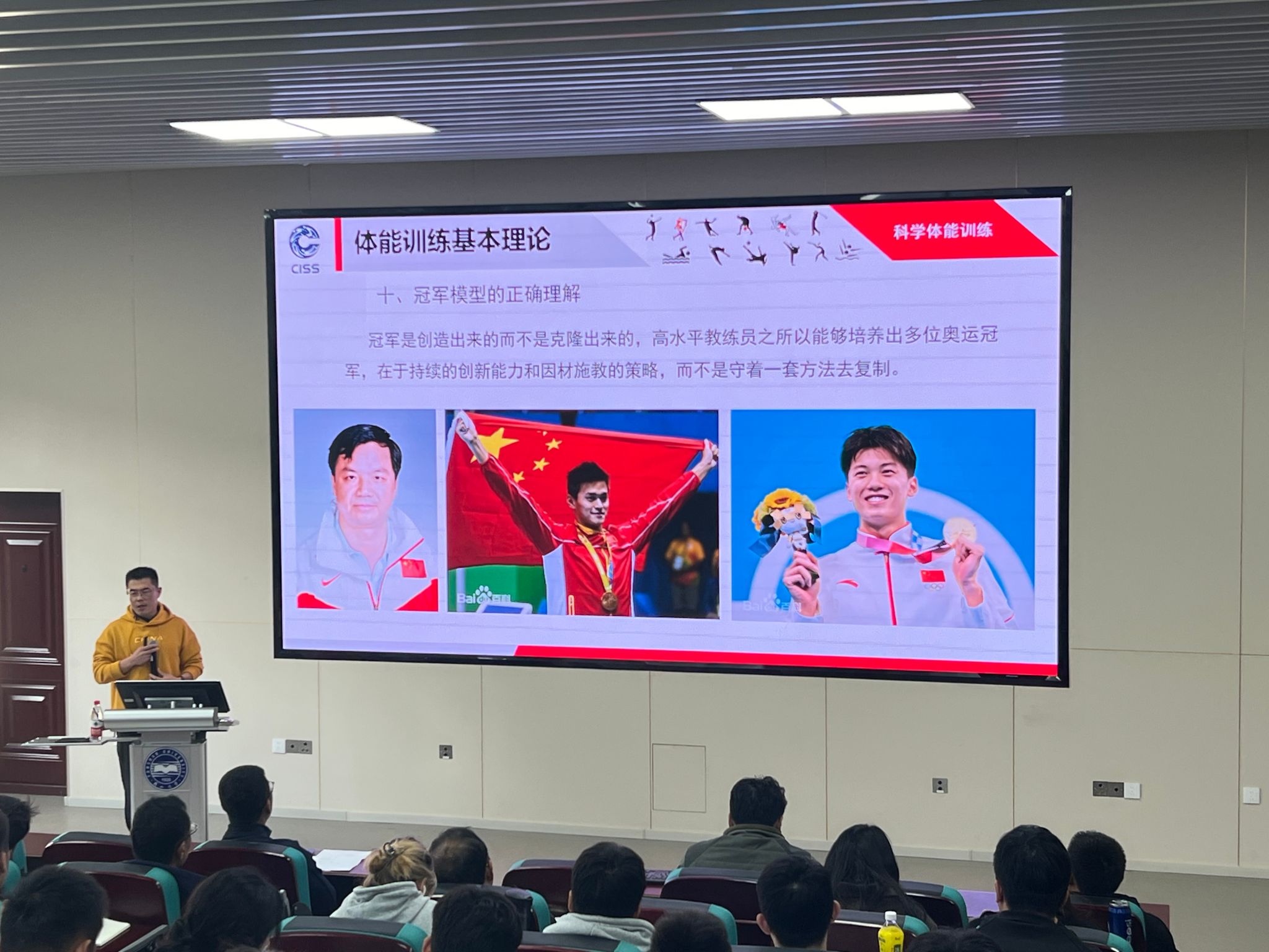 在案例分享环节,王博士详细介绍了他在执教国家曲棍球队和国家游泳队期间的体能训练经验,特别是2024年巴黎奥运会男子100米自由泳冠军,奥运会世界纪录保持者潘展乐的体能训练案例。他提出,应基于冠军模型为不同训练对象拟合个性化的训练路径,而非简单复制,突出了个性化训练的关键作用。这不仅让同学们对高水平运动员的专业体能训练工作有了更加深入地认识,也为各位老师提供了宝贵的教学思路。在问答环节中,员工们纷纷提出了自己在体能训练方面的疑问,王明波博士从专业的角度耐心地逐一进行了解答。