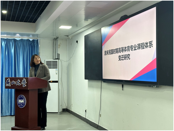 徐延丽老师以《清末民国时期高等体育专业课程体系变迁研究》为题,详细介绍了近代高等体育专业课程设置的发展历程,整个研究史论结合,论据充实。几位专家在肯定其史料详实、结构完整的同时,也就研究的章节设置、研究主线、核心概念、史料呈现和展示度提出了改进思路。
