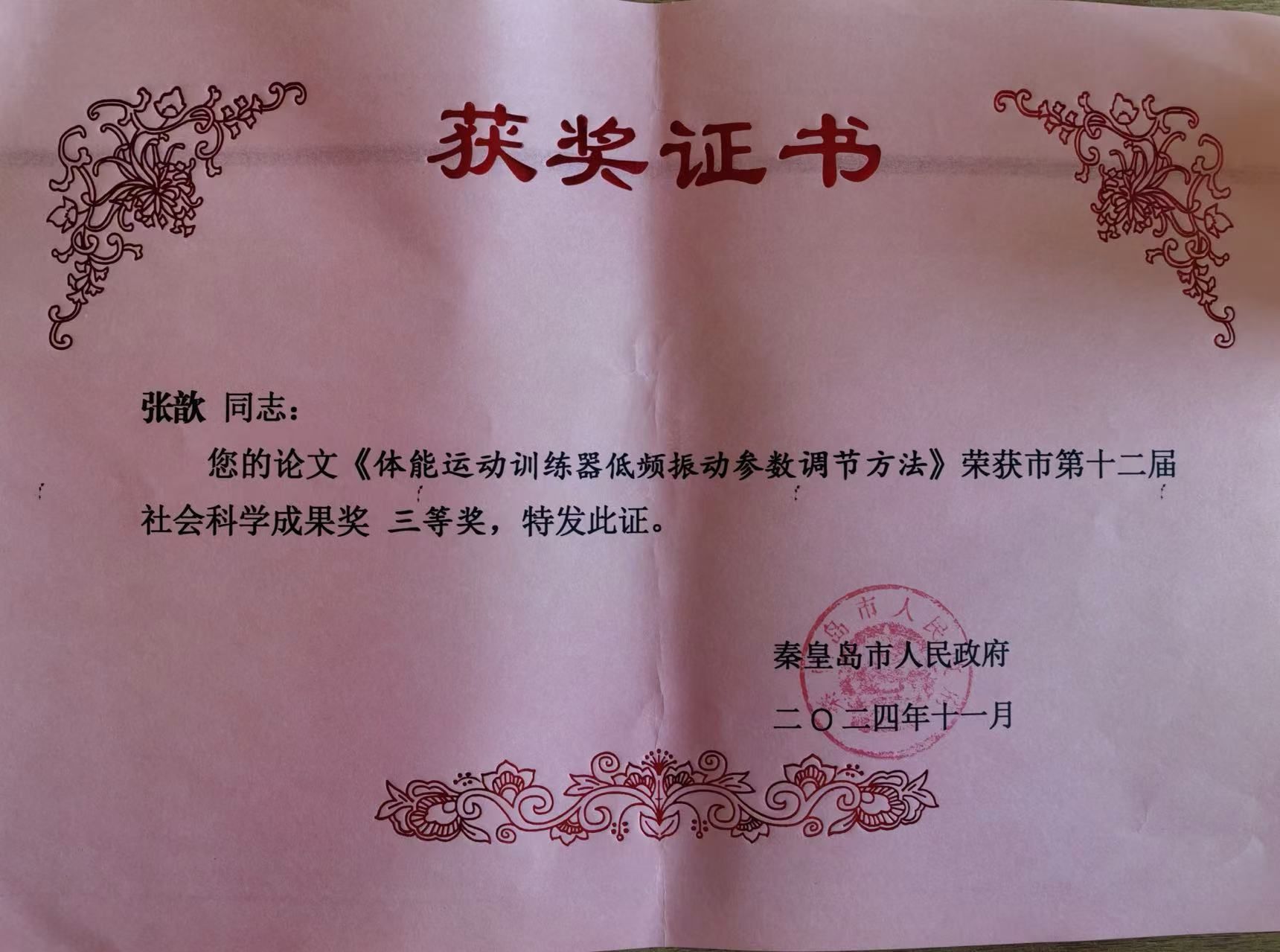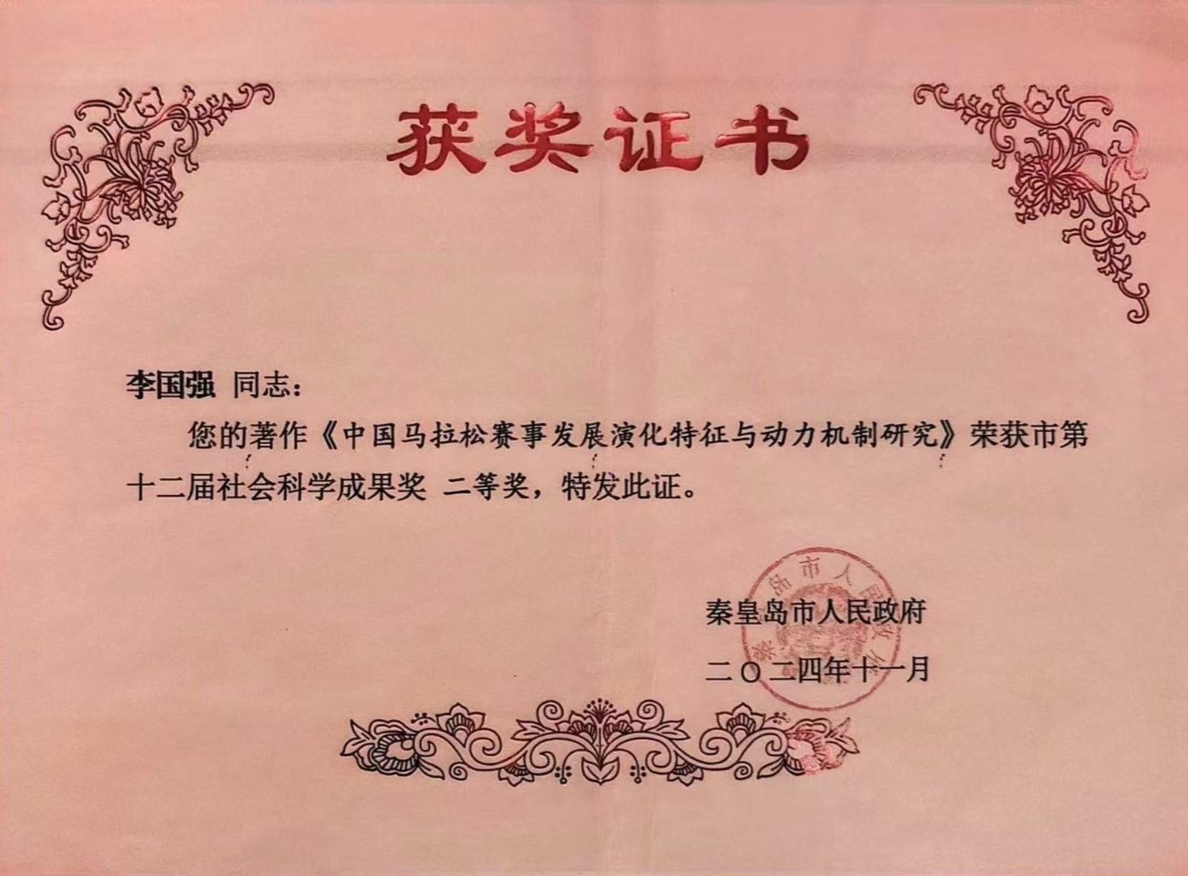 王玉扩教授的《明思路 补短板 提升我市健康村镇建设质效的建议》荣获调研类一等奖。王玉扩教授长期从事体育公共政策研究,其主持完成《秦皇岛市健康村镇高质量发展实现机制与路径研究》课题,主要针对秦皇岛市健康村镇建设政策、卫生基础设施、村镇医生队伍建设、村镇环境卫生治理、居民健康教育普及五个方面深入调研。课题报告提出的对策建议,对秦皇岛市国家卫生城市建设、美丽乡村建设,具有重要的推进意义。李国强老师的《中国马拉松赛事发展演化特征与动力机制研究》荣获著作类二等奖,张歆老师的《体能运动训练器低频振动参数调节方法》荣获论文类三等奖。