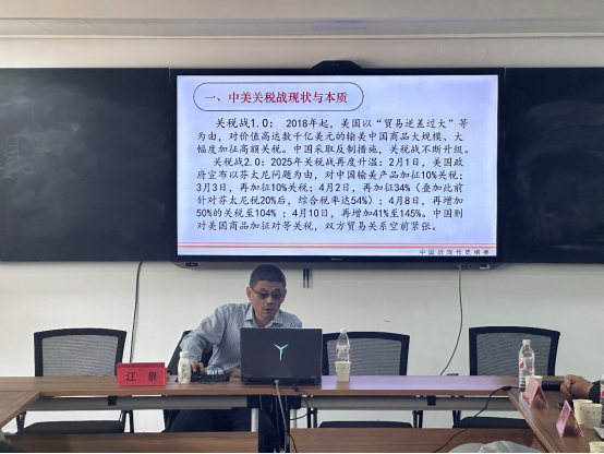 会议伊始,江泉老师就中美贸易摩擦相关问题进行了主题讲座。他指出,中美贸易战是百年未有之大变局下美国以关税为武器遏制中国产业升级和社会发展的战略竞争。尽管我国取得了阶段性胜利,但仍需做好充足准备迎接未来中美在高端科技、贸易规则、地缘冲突等领域的潜在摩擦风险。